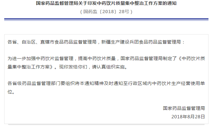 中藥飲片是中藥的重要組成部分,既可以用于中醫(yī)臨床配方使用,也可以用于中成藥生產(chǎn),其質(zhì)量關(guān)乎人民群眾用藥安全有效。近年來,各級藥品監(jiān)管部門持續(xù)加大對中藥飲片監(jiān)督檢查和抽檢力度,依法查處和曝光違法違規(guī)企業(yè)和不合格產(chǎn)品,中藥飲片總體質(zhì)量狀況有所好轉(zhuǎn),但存在的問題仍不容樂觀。為進(jìn)一步加強(qiáng)中藥飲片監(jiān)督管理,提高中藥飲片質(zhì)量,國家藥品監(jiān)督管理局決定在全國范圍內(nèi)開展為期一年的中藥飲片質(zhì)量集中整治,具體方案如下: